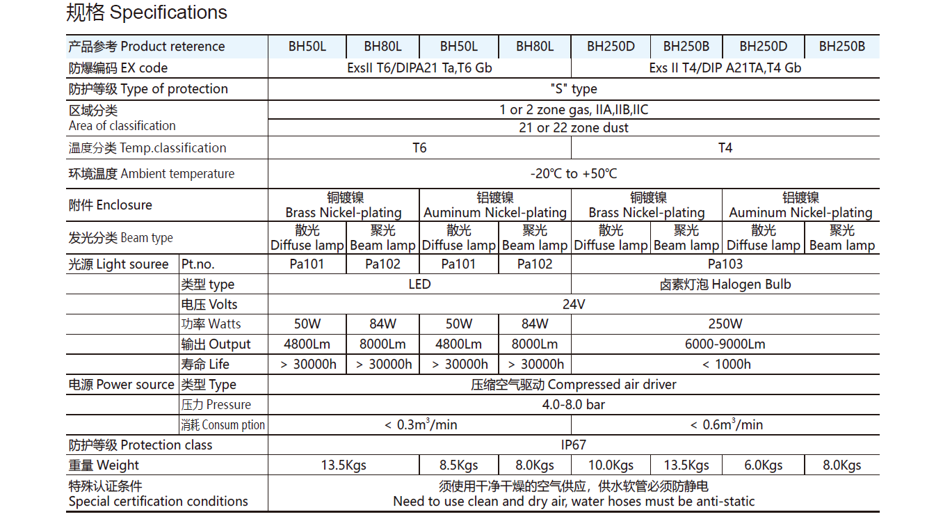 Exs II T4 Aluminum Air Driven 4.0-8.0 Bar Halogen Diffuse 24V 250W Explosion Proof Pendant Light | BH250D