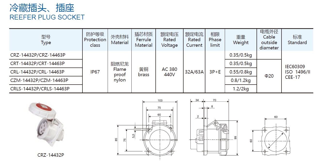 Standard: IEC60309, ISO 1496/IICEE-17